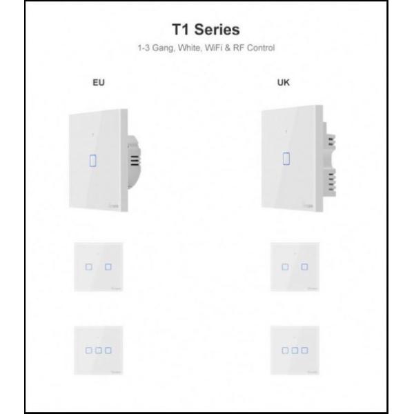The WiFi smart switches with 1-3 gangs are divided into T0(EU & UK &US), T1(EU & UK), T2(EU & UK &US) and T3(EU & UK &US). T3 is available in black, and T0, T1 and T2 are available in white. Additionally T1, T2 and T3 support 433MHz remote controller to control.
